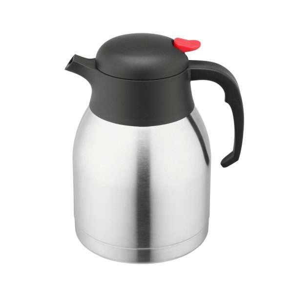 Stainless steel vacuum jug with black plastic cover, handle and red push button. Vacuum jug is with simple and clean design. Capacity of 1.5L is good for serving in restaurant and party. The satin polish surface is good for preventing finger print on it.